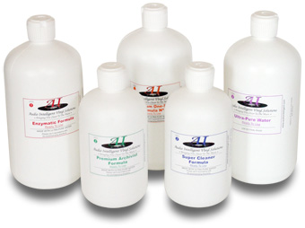 Having returned to analog playback after a dozen years away, I have relearned a few immutable lessons, including the importance of cleaning LPs -- all LPs, even those that are brand new. The difference between a seemingly clean record and one that's actually clean is dramatic, with noise reduced not only for the first play but subsequent ones as well. Removing as much grunge as possible preserves the sanctity of the groove, so each play is a quieter experience. Anything left in there can become a permanent part of the record, the action of the stylus bonding it to the vinyl like a steamroller does with a stone in asphalt. Many of the newest cleaning products on the market are formulated for cleaning deep into the groove and removing things like mold-release agents and oils from our hands that can be especially difficult to eliminate. Count the Audio Intelligent Vinyl Solutions line of cleaning products among these. It comprises individual cleaners and combinations of cleaners that aim at "removing a wide range of contaminants." In addition to separate cleaners for vinyl and shellac records, AIVS has a three-product regimen that uses an enzyme-based fluid, a general cleaning fluid, and a water rinse. If this sounds like something you've already read about on SoundStage!, you have a good memory. Lloyd Walker's Prelude Deluxe kit uses similar cleaning products. But there are a couple of distinct advantages to the AIVS system, and I'll discuss these below. The AIVS fluids range in price from $10-$32.50 USD per bottle, depending on product type and size, and they are sold together in kits at a slight discount. While the Walker Audio system includes everything you'll need to clean records (except a record-cleaning machine, which Lloyd Walker considers mandatory), AIVS sells only fluids. You'll have to look elsewhere for cleaning cloths and brushes (I have some suggestions). The first step in the AIVS regimen is the use of the Enzymatic Formula ($18 per 16-ounce bottle), which, as its name implies, uses enzymes. These are effective on water-insoluble and protein-based stains, including mold-release compounds, fingerprints, fungi and bacteria. Of course, there are chemical detergents that can remove these as well, but would you want those on your records, especially in concentrations needed to remove really tough stains? The enzymes replace the detergents and make for a more dilute solution that's better for your records. After the Enzymatic Formula comes either the Super Cleaner Formula or Premium Archivist Formula (both $18 for 16 ounces). The chief difference between them is one ingredient: isopropanol, or isopropyl alcohol, a widely used solvent. Some people believe that it harms vinyl, making it brittle and more susceptible to stylus wear. Others, myself included, apply fluids that use isopropyl alcohol sparingly and leave them on the vinyl for very short periods, thoroughly vacuuming them off instead of blotting them up (and perhaps into the vinyl). I've seen staff in used-record stores use isopropyl alcohol straight out of the bottle to clean LPs. I wouldn't recommend this, but I've bought LPs at used record stores, and generally when they look clean, they sound clean as well. Still, if the idea of putting any alcohol on your LPs is anathema, use the Premium Archivist Formula, which has none. Otherwise, the Super Cleaner Formula is the way to go, and it's what I used. Finally, AIVS recommends finishing up with a water rinse, but not just any water. Its own Ultra-Pure Water ($10 per 16-ounce bottle) is filtered and de-ionized in a six-step process, producing a research-grade fluid. "The result," according to AIVS, "is water that is more than 50 times purer than distilled water." AIVS provides detailed instructions on its website for using the various cleaners; many of us will consider the instructions a starting point, then add our own wrinkles. Most significant is the company's support for cleaning by hand, which is something Walker Audio does not advocate. I followed the AIVS directions and achieved decent results without a record-cleaning machine. Some nappy microfiber cloths I found at Wal-Mart worked pretty well with the fluids -- a different cloth for each fluid -- but the recently introduced Mobile Fidelity record brushes worked far better for spreading the fluid and scrubbing gently into the grooves (I still had to use a cloth to remove the fluids).